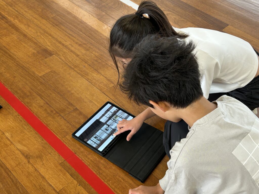 小学部体育のハードルの授業です。何回か走ってみて、友だちがタブレット撮影してくれた動画を見てフォームを修正します。友達の意見を聞きながらの、CTを使っての振り返り。子どもたちの意見交換にたっぷり時間をかけます。学びは深まります。